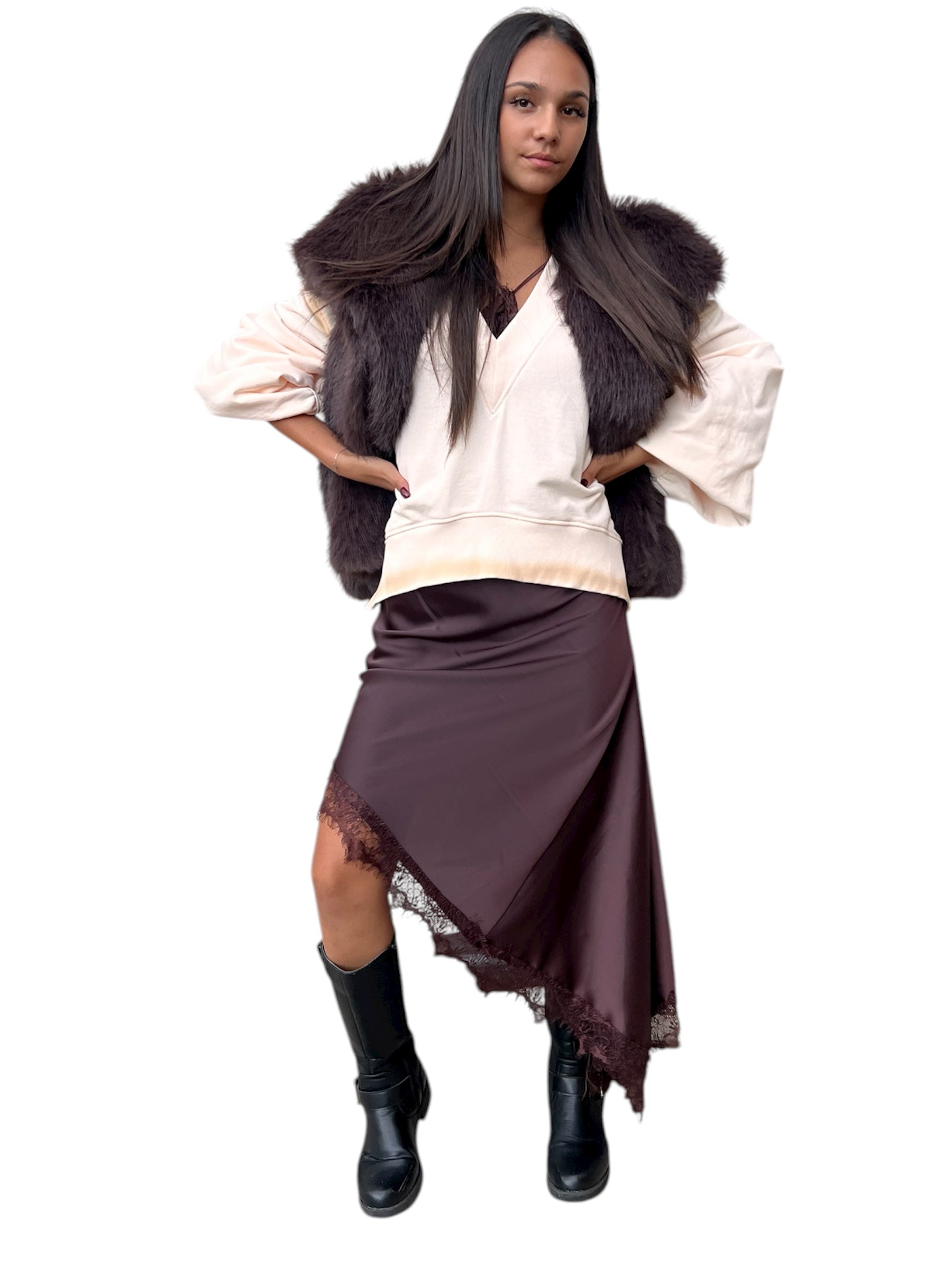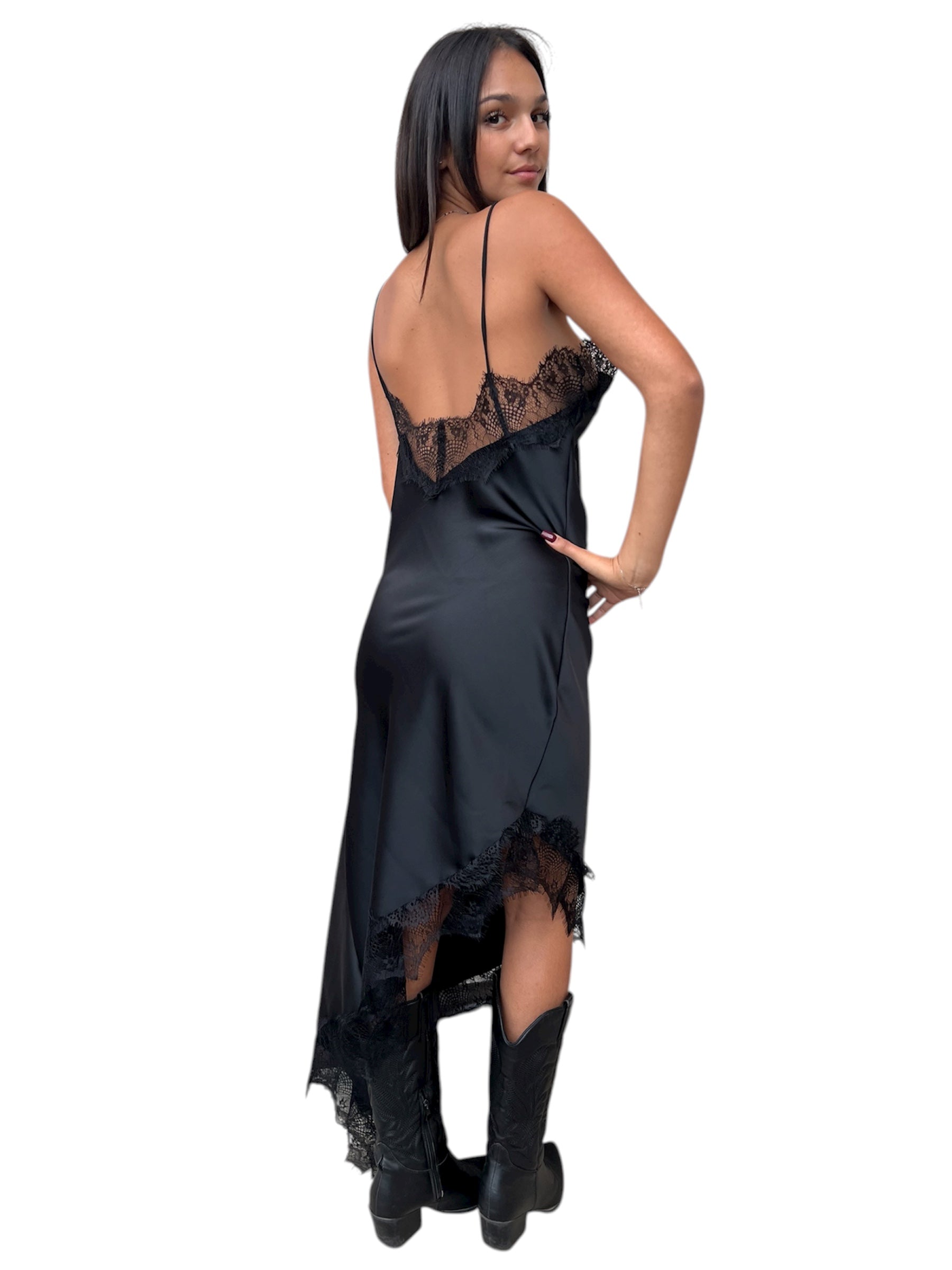 Abito corto / maxi canotta in satin con dettagli in pizzo, spallina elastica non regolabile incrociata nel davanti.