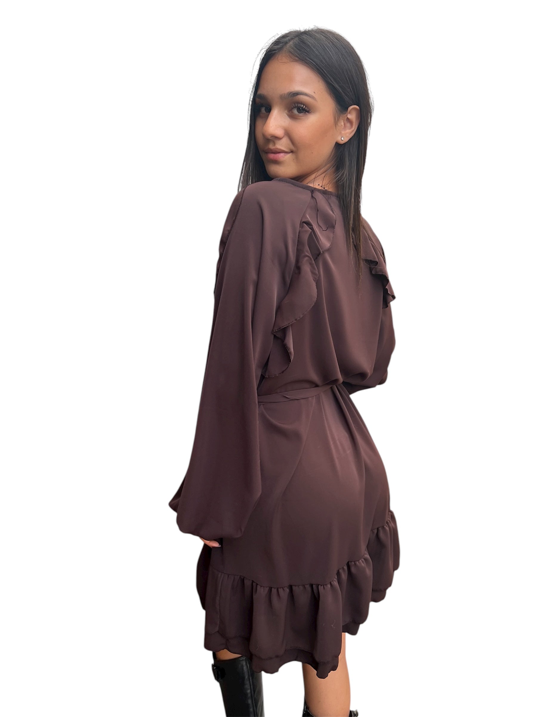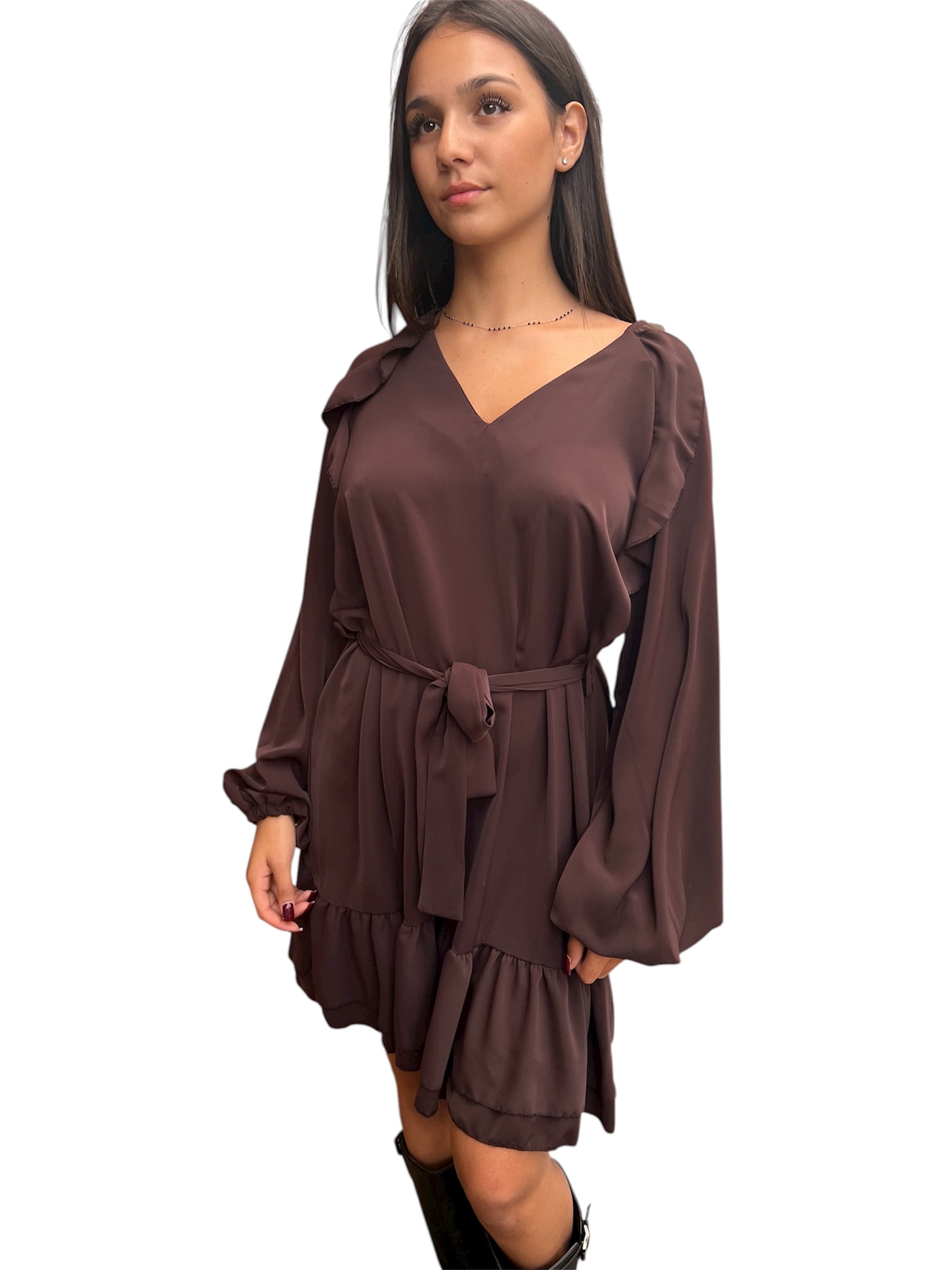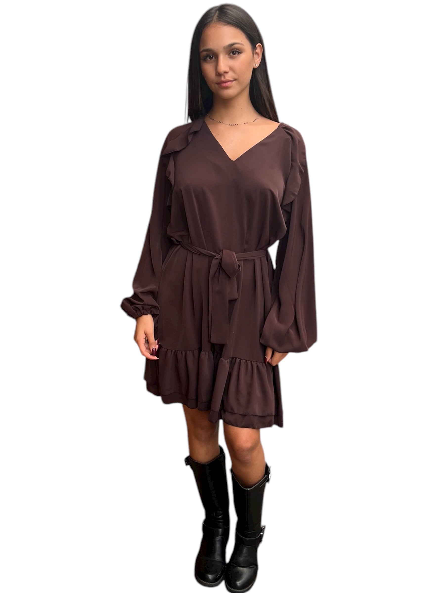 Abito corto con manica lunga con elastico nel polso, scollato a V con rouge nella spalla, cinturina inclusa dello stesso tessuto, balze finali