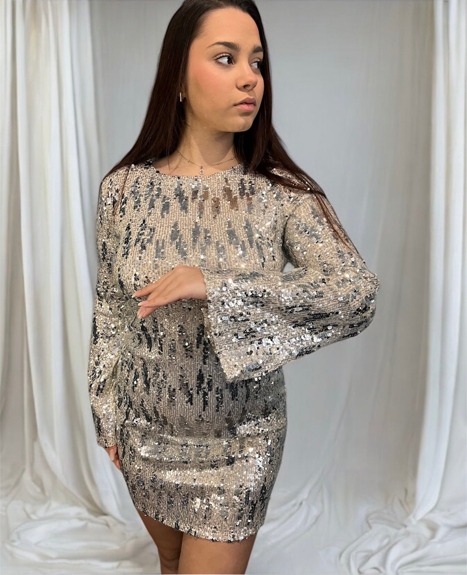 Abito tubino tempestato di paillettes, con manica a campana, e aperto nella schiena, morbido al tatto non pizzica a contatto con la pelle perché presenta la sottoveste all'interno.