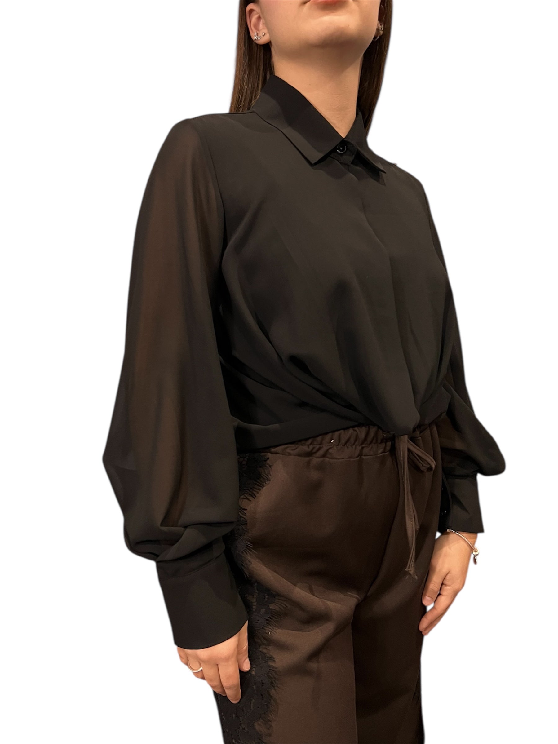 Camicia corta con elastico dietro unico bottone nel collo come chiusura apertura a goccia nel davanti che forma un drappeggio, manica a sbuffo