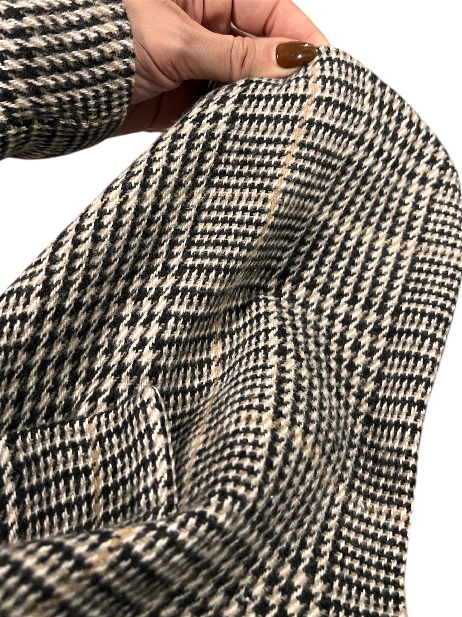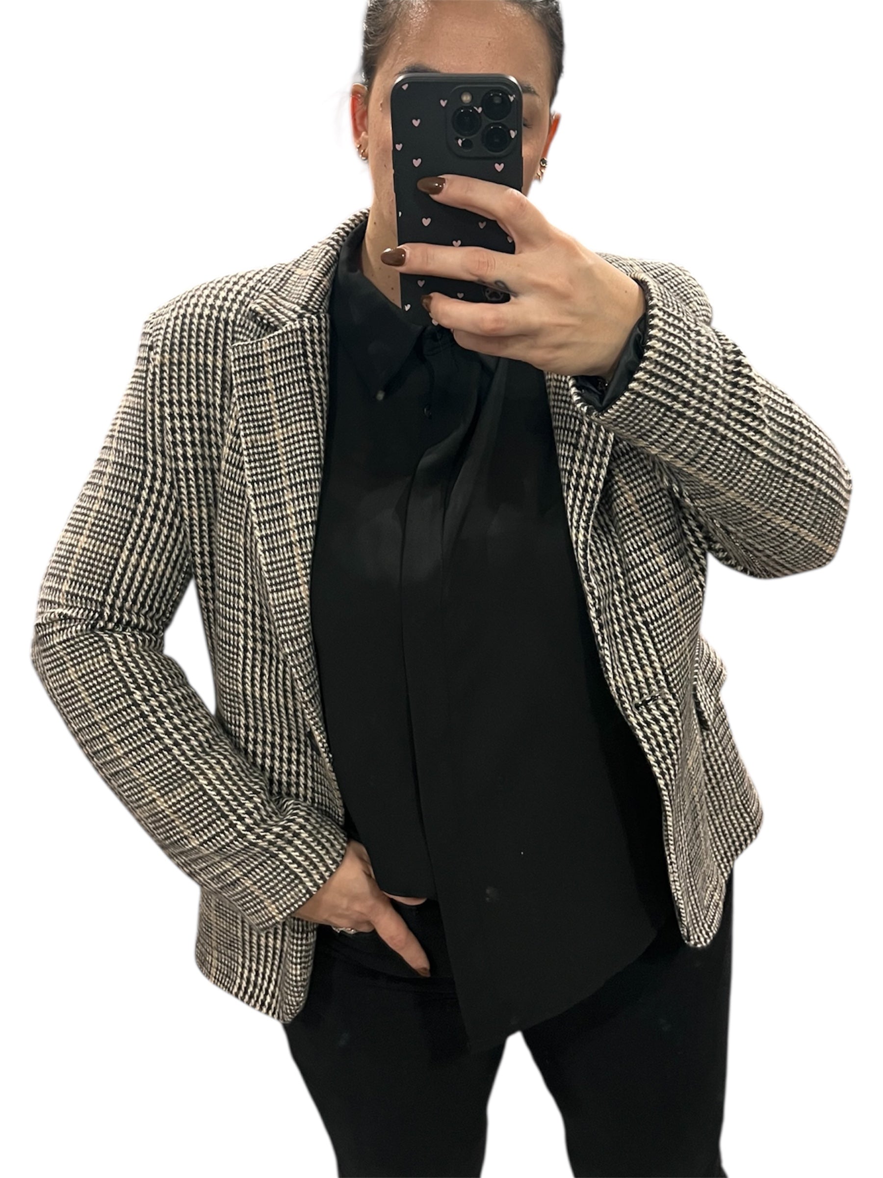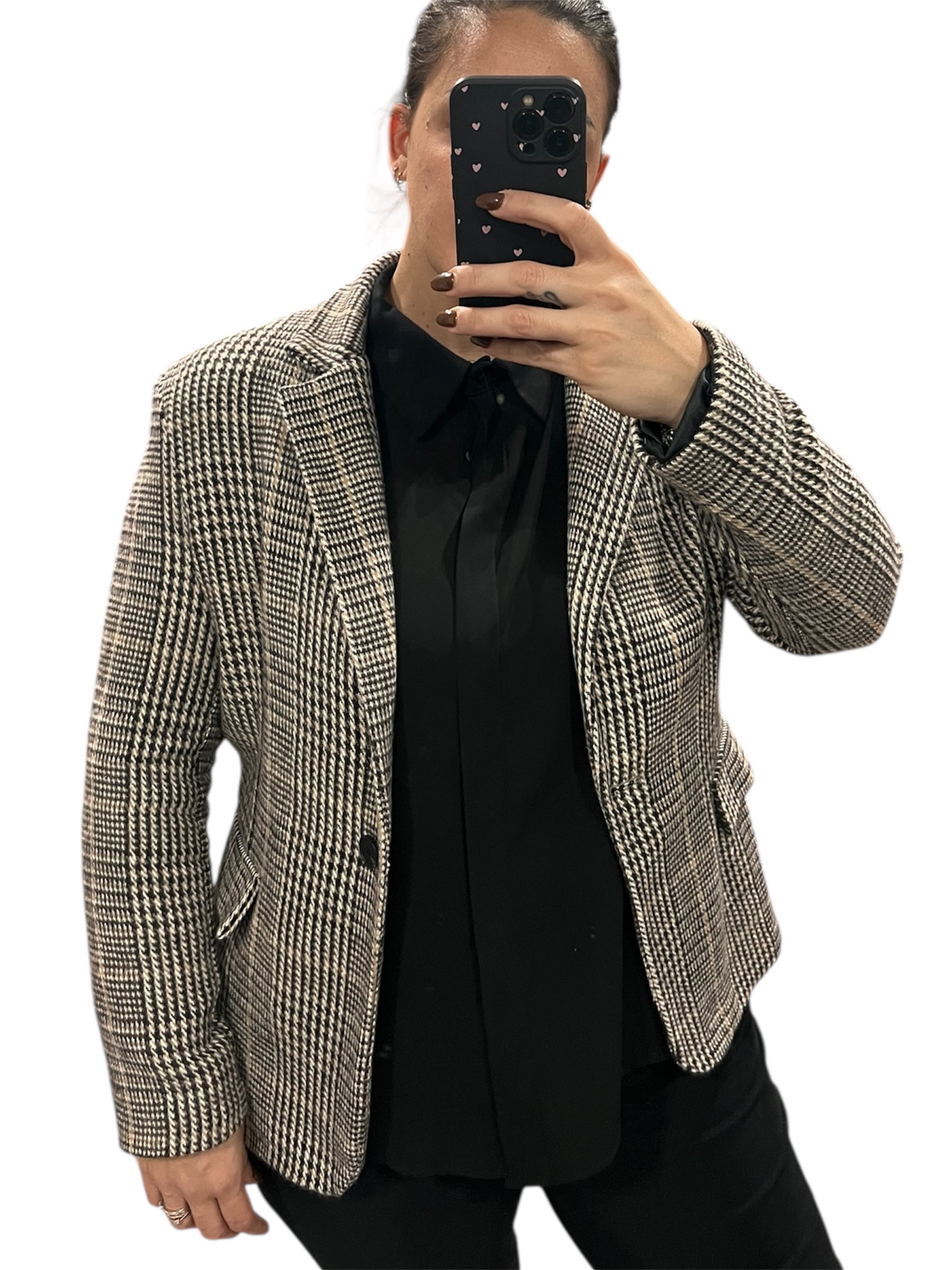 Giacca in pied de poule dal fit leggermente oversize, unico bottone come chiusura, spallina imbottita e fodera all’interno