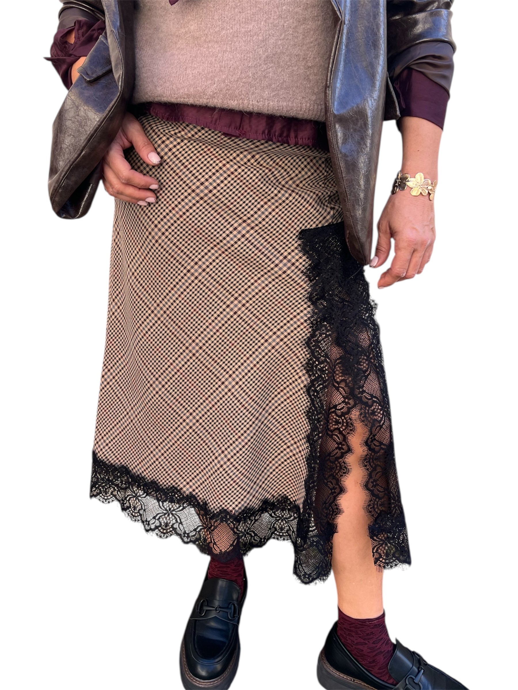 Gonna midi in fantasia pied de poule con dettaglio a contrasto del pizzo, elastico in tutta la vita.