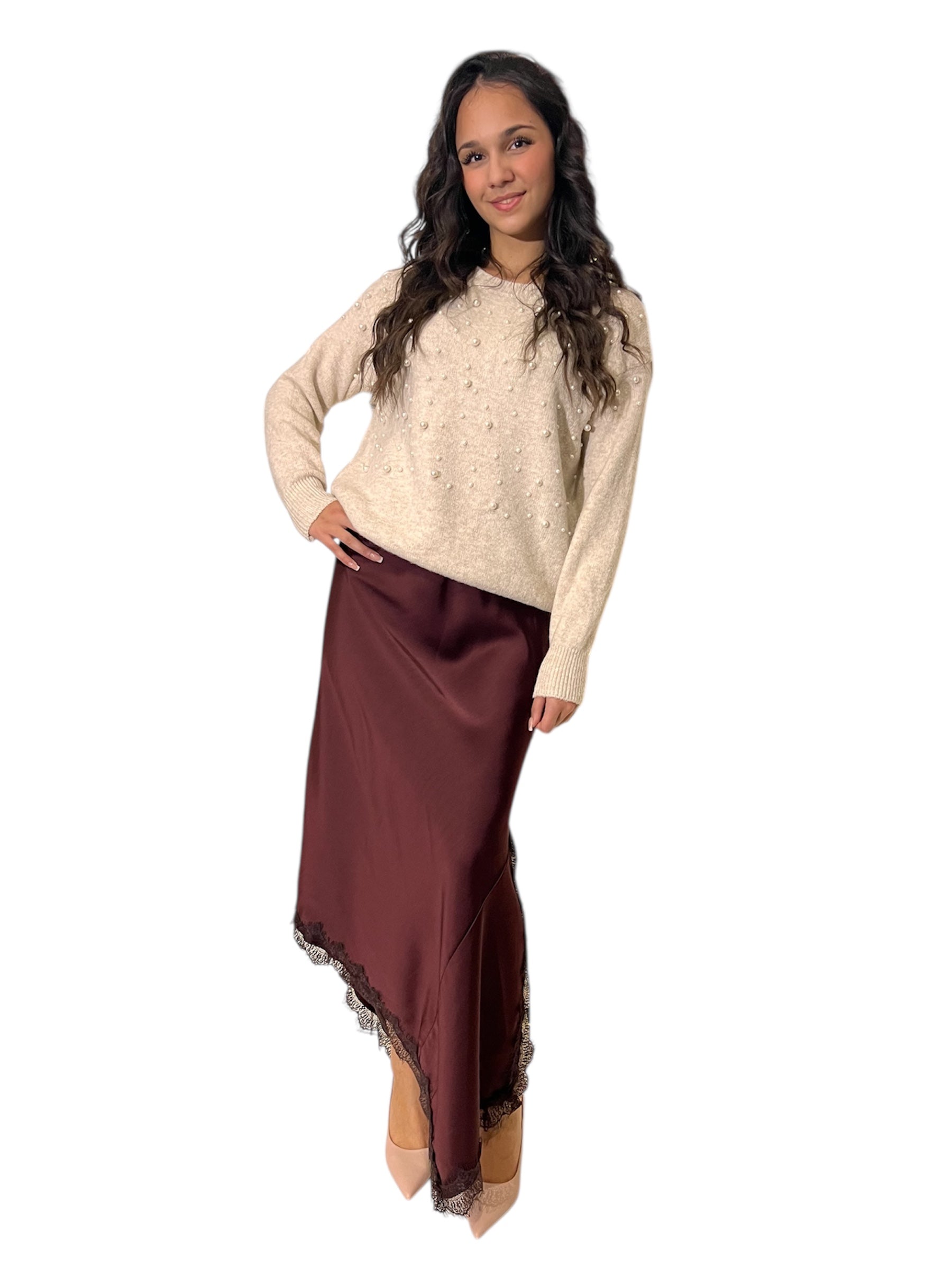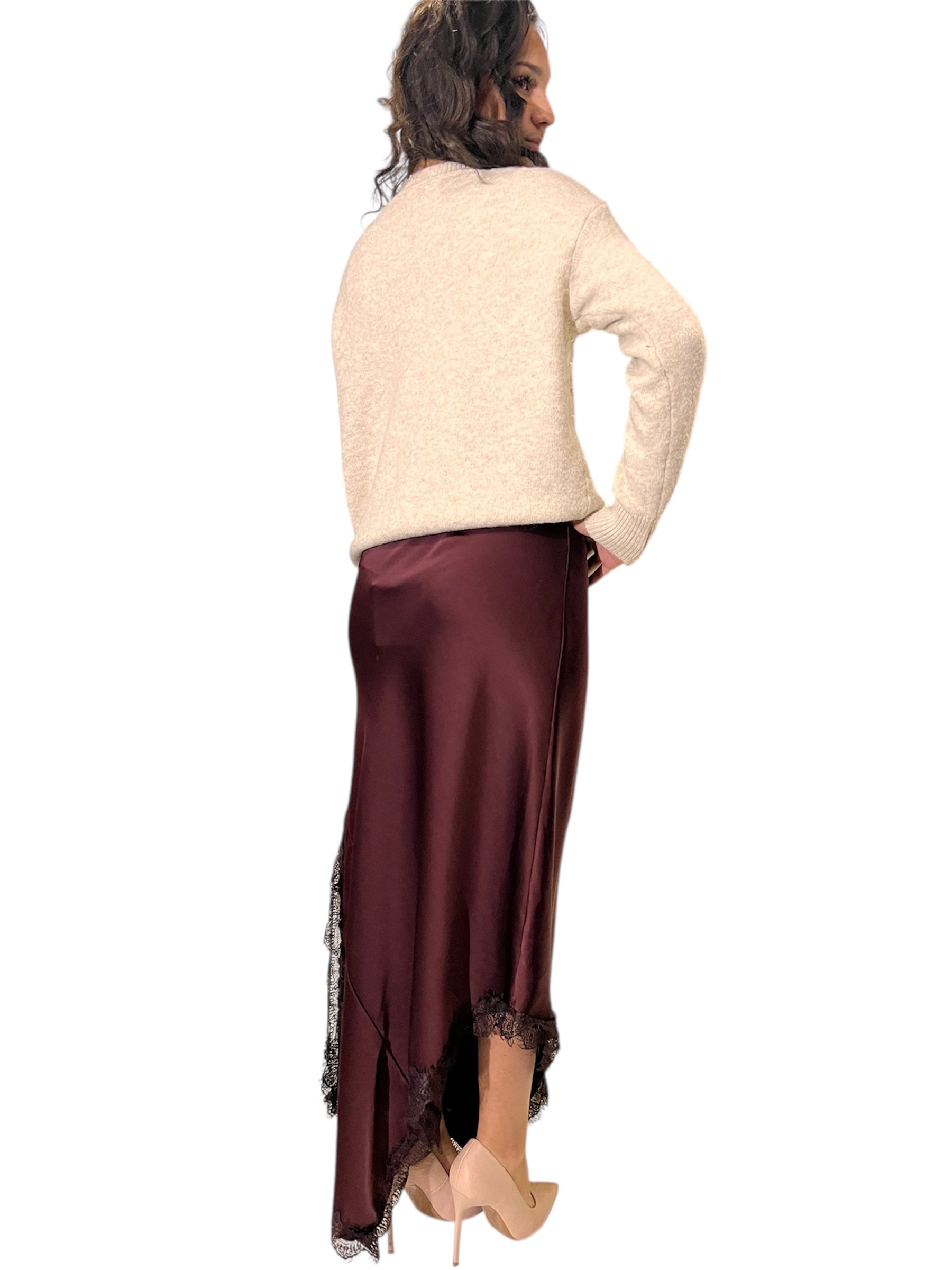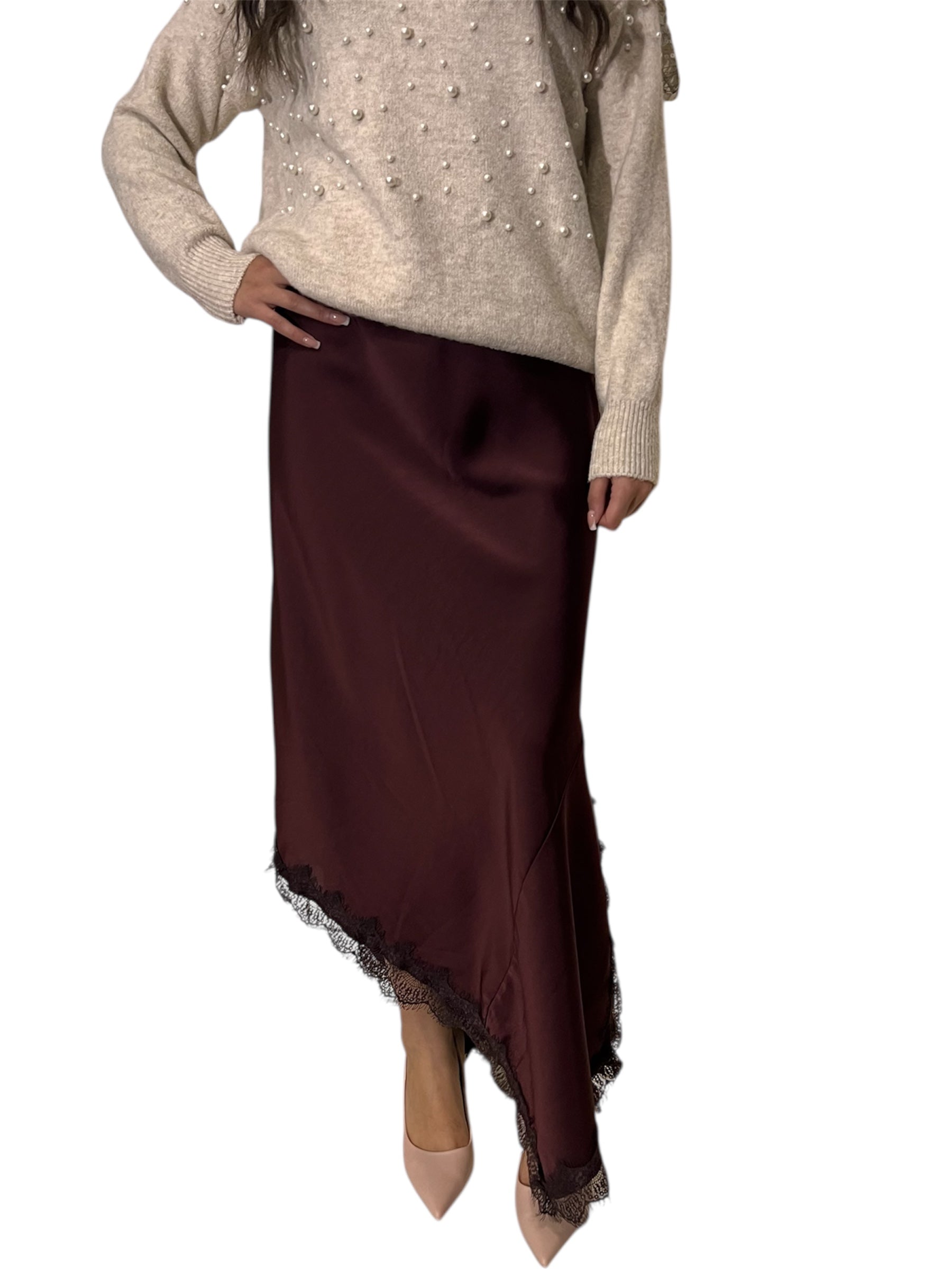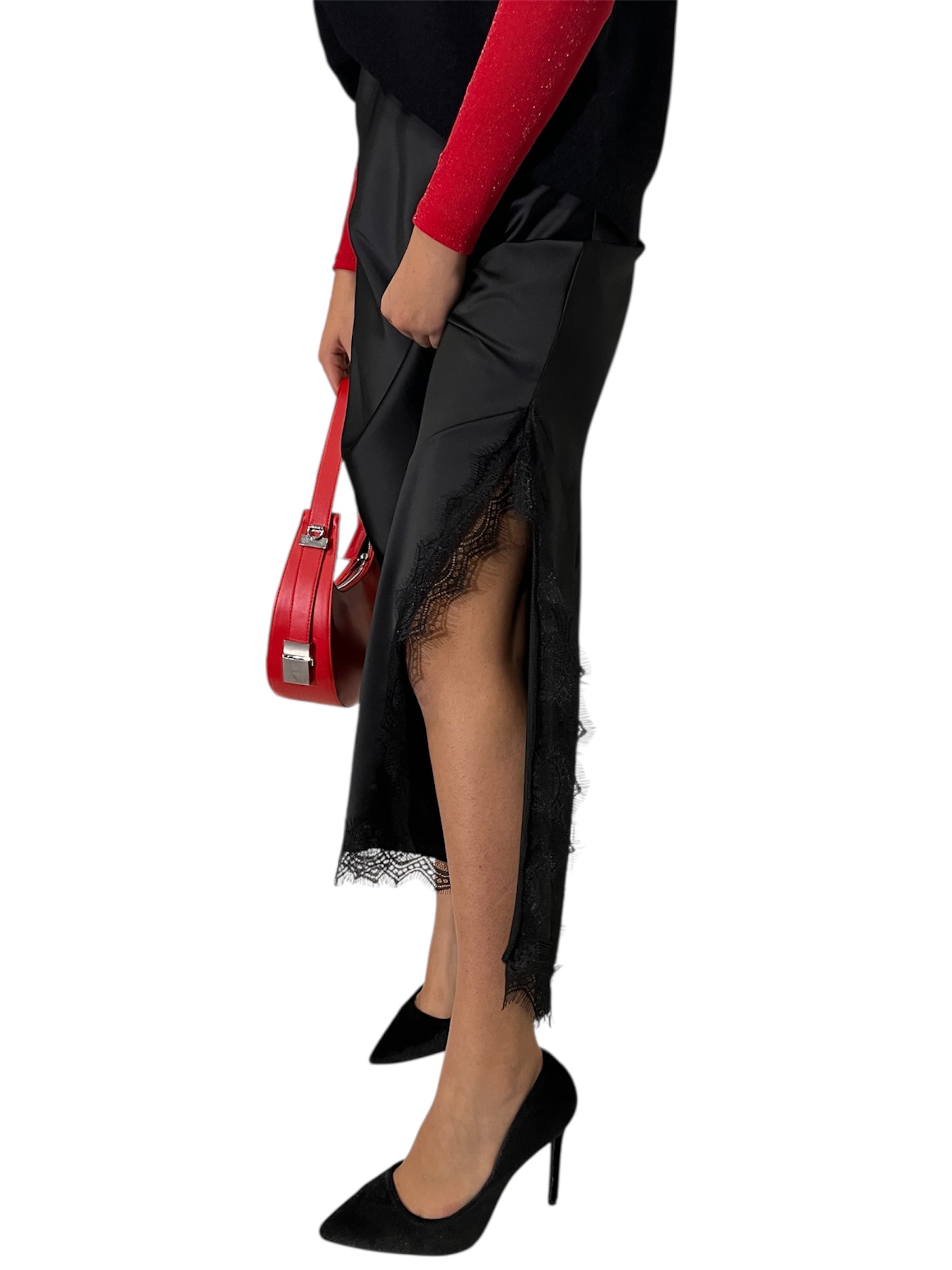 Gonna lunga in satin assimetrica con dettaglio pizzo, spacco laterale e elastico in vita