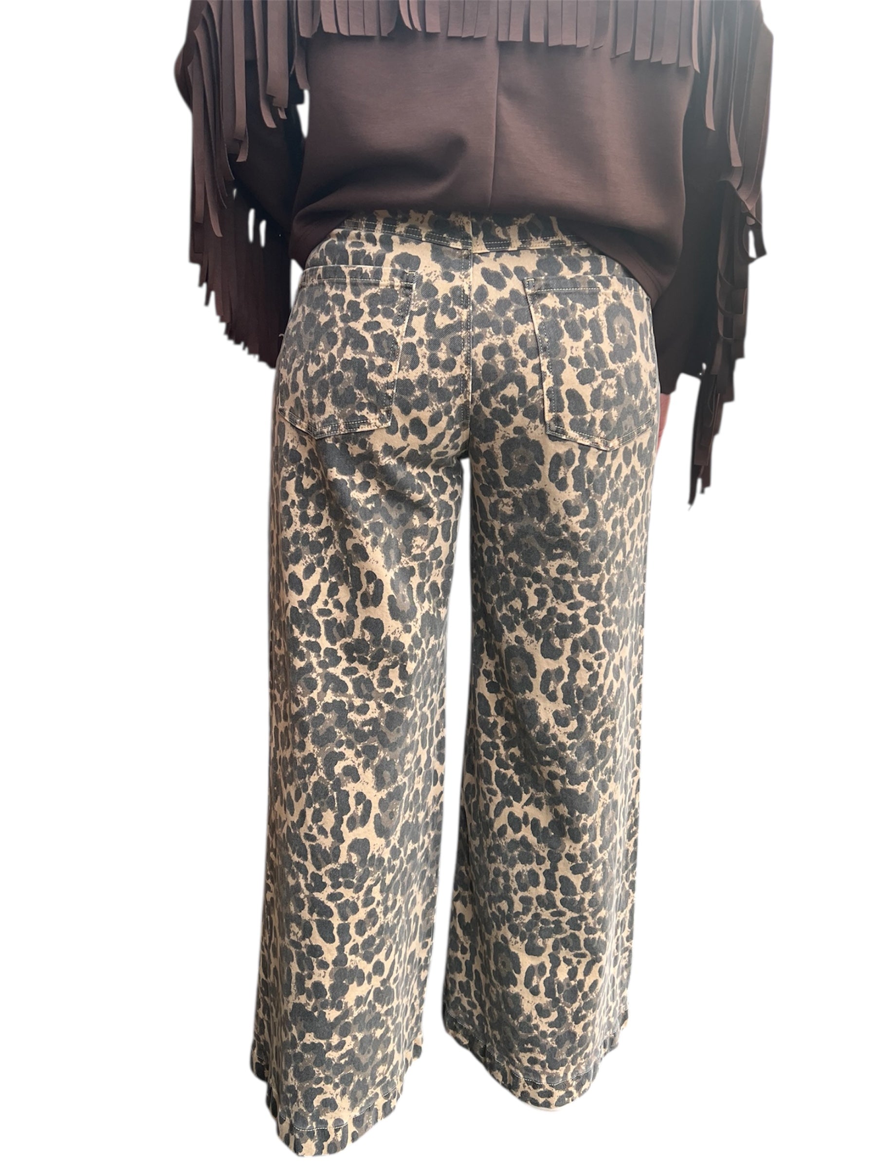 Jeans a vita alta elasticizzato gamba scende a palazzo con fantasia maculata.