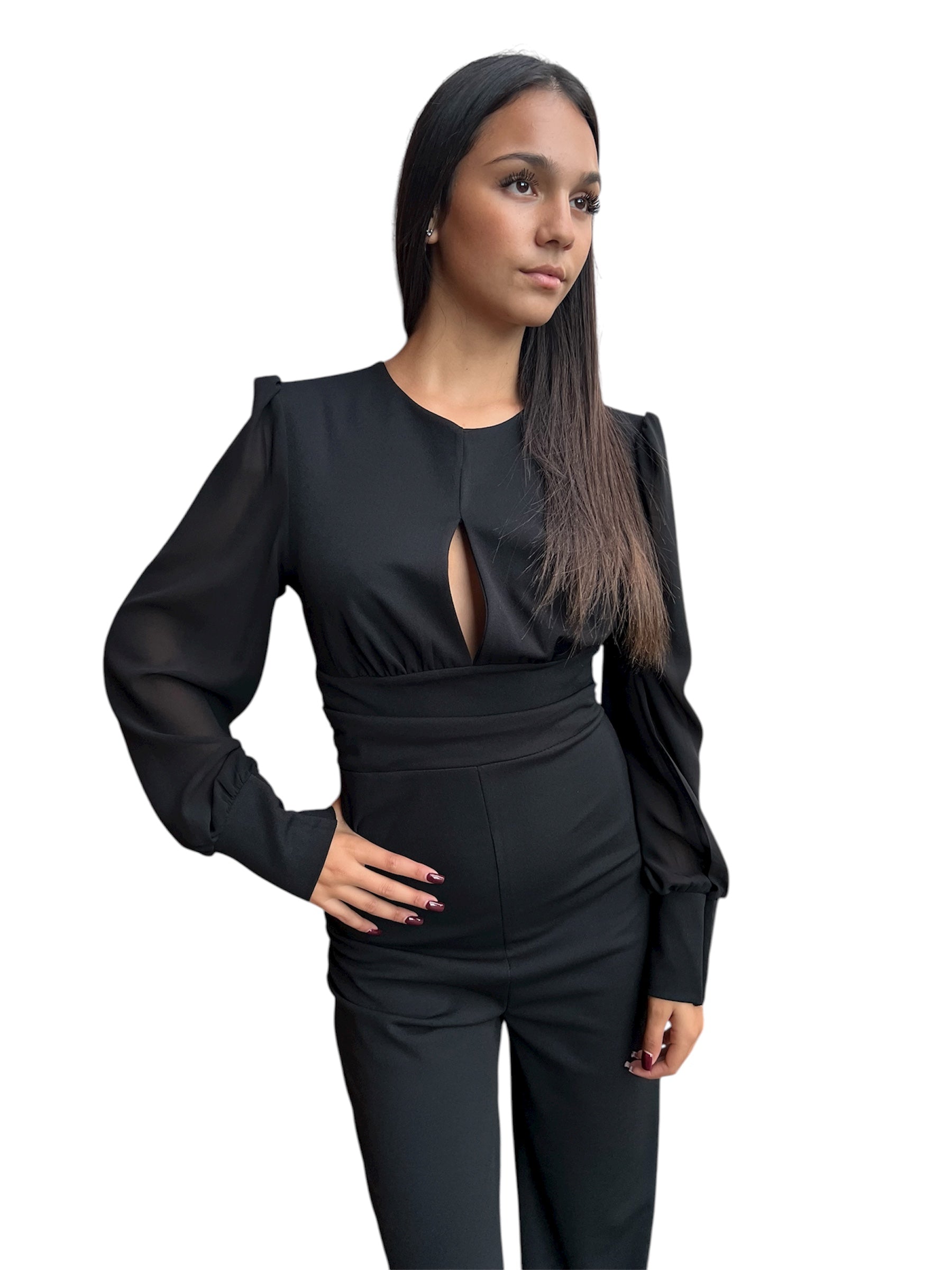 Tuta intera, con pantalone a palazzo con dettaglio goccia davanti, tessuto maniche velato rispetto al resto della tuta e leggermente a sbuffo, zip come chiusura nella schiena.