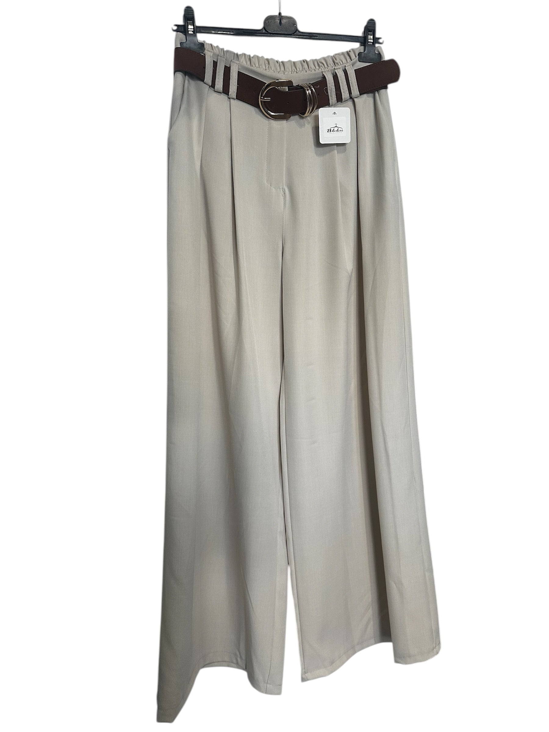 Pantalone a palazzo con bottone e zip davanti e elastico dietro, tasche laterali e pence nel davanti