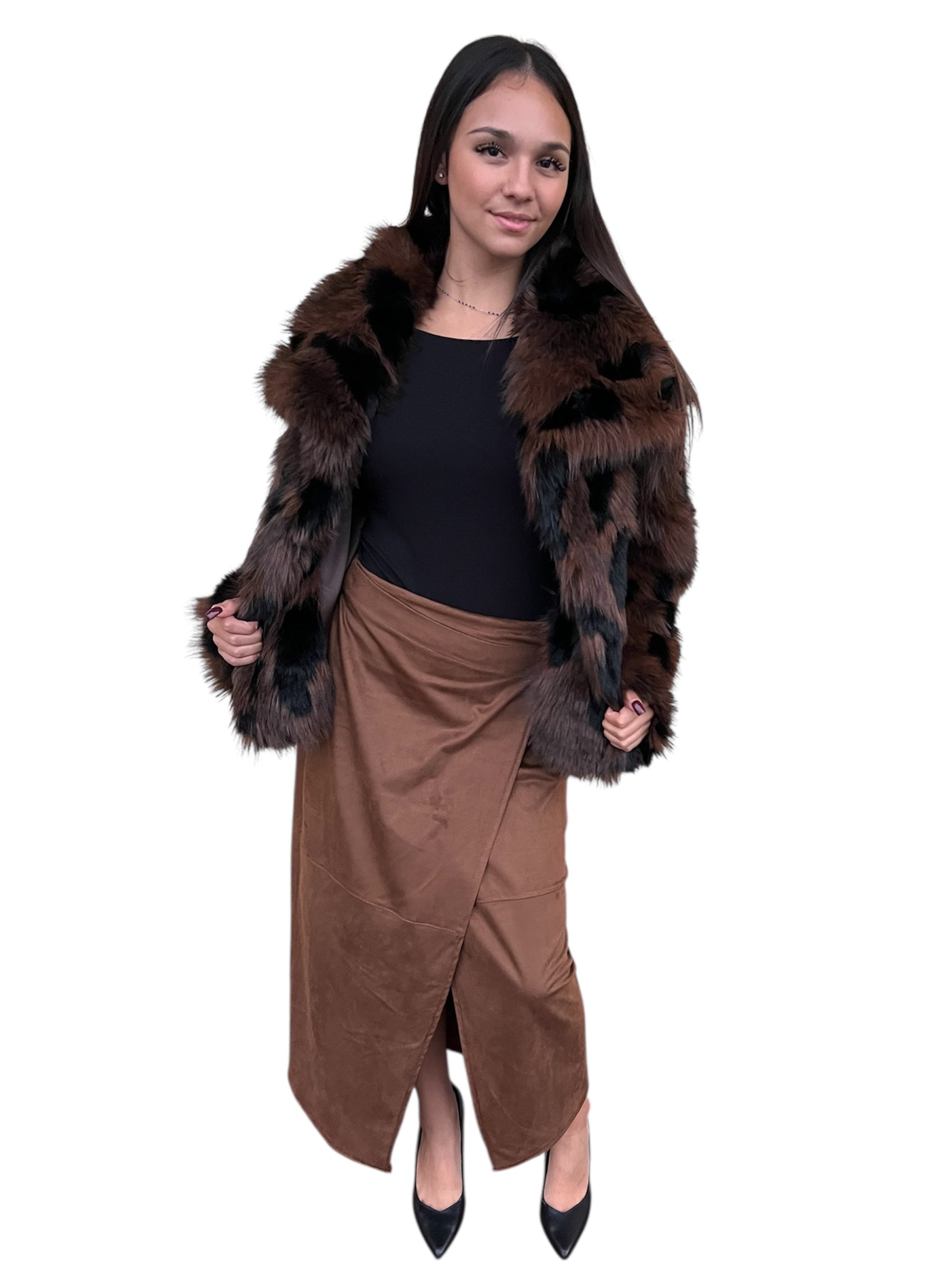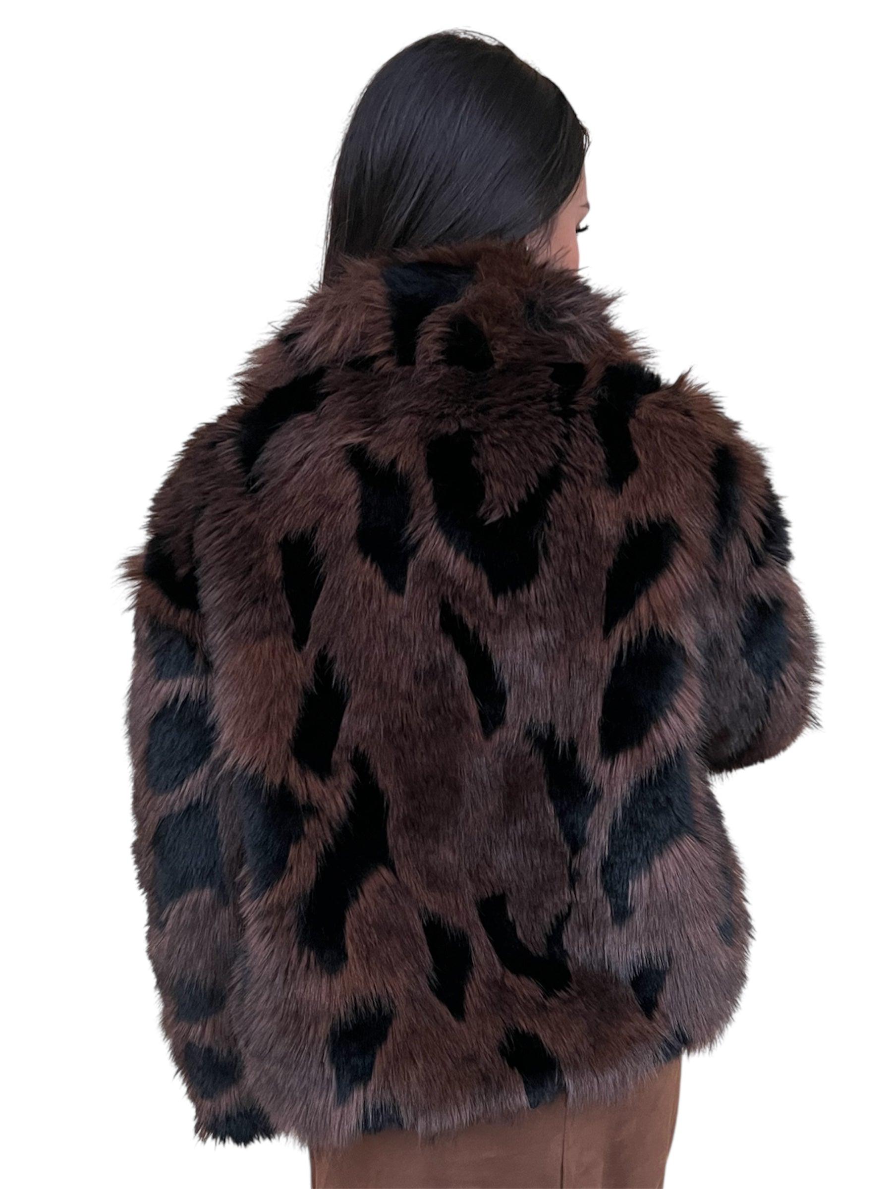 Pelliccia a pelo corto doppio colore marrone e nero, chiusura con gancetti